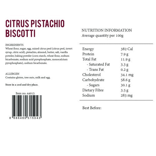 Baked with fresh Italian pistachios and a dash of mixed peel to make for a refreshing tea-time snack. Best dipped in an espresso!