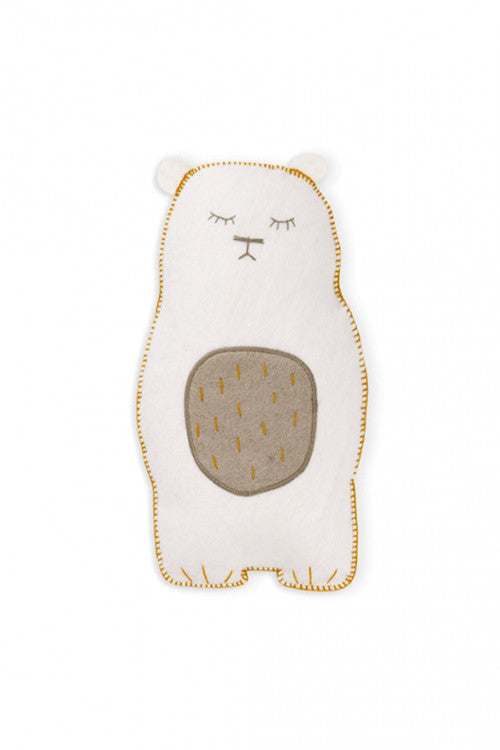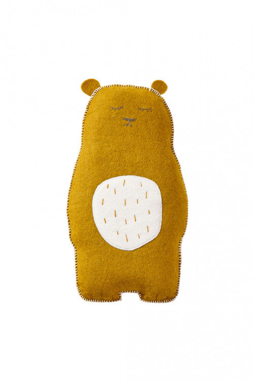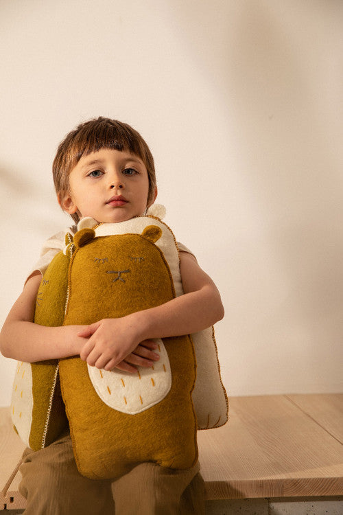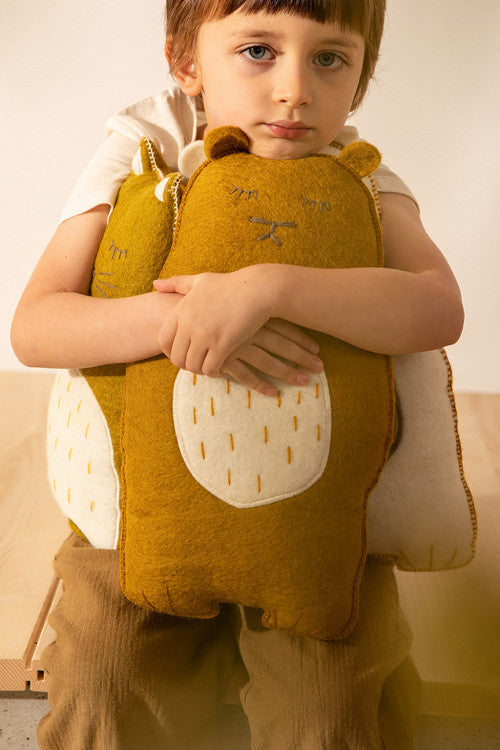It’s MUSKHANE’S take on nostalgia… the GRIZZLY PASU CUSHION recalls the comforting image of the little bear who accompanied our beloved childhoods. Fashioned in felt and sewn by hand by our artisans in Nepal, this half-decorative, half-cuddly cushion continues the teddy-bear tradition in an original and playful way. A fond memory we have the honour of passing down to our children.