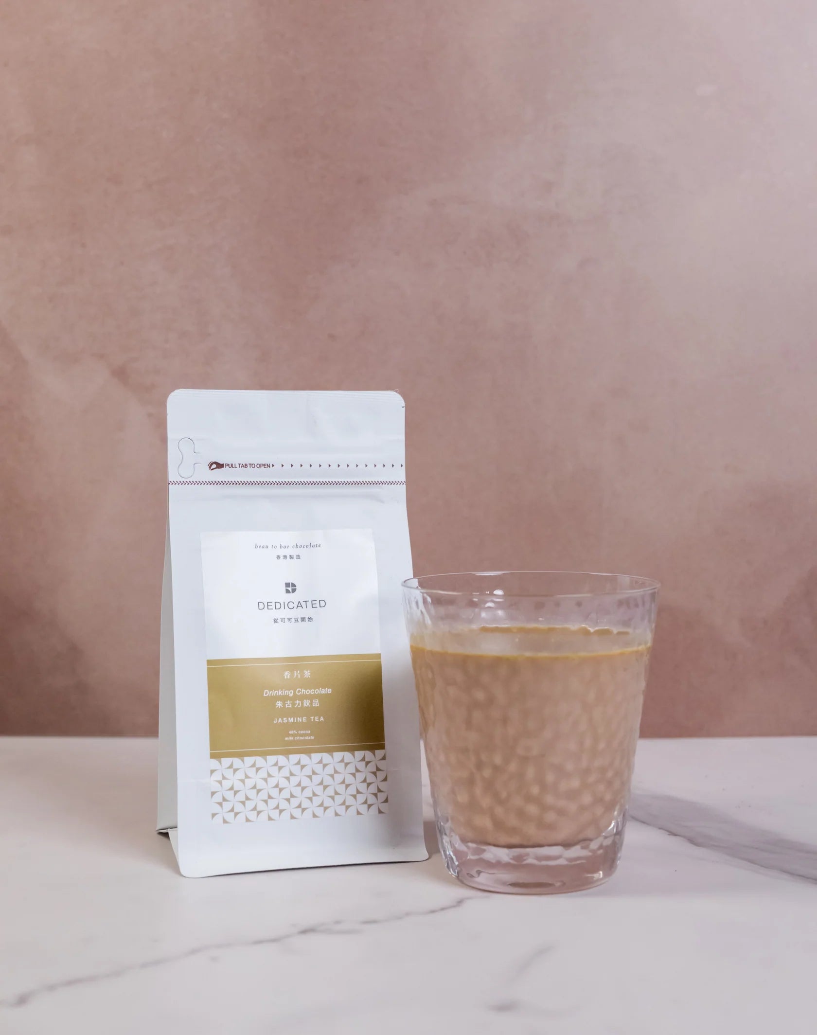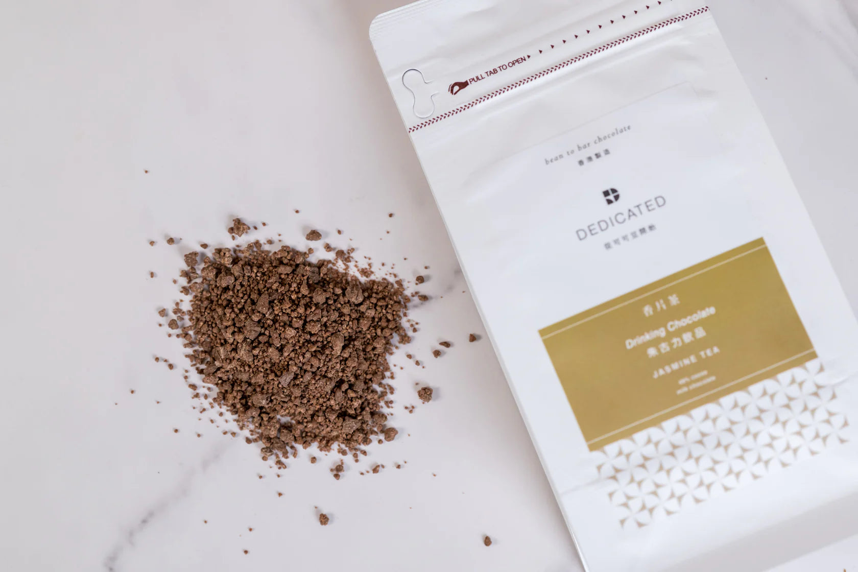 Ground jasmine tea milk chocolate powder for making chocolate drink.