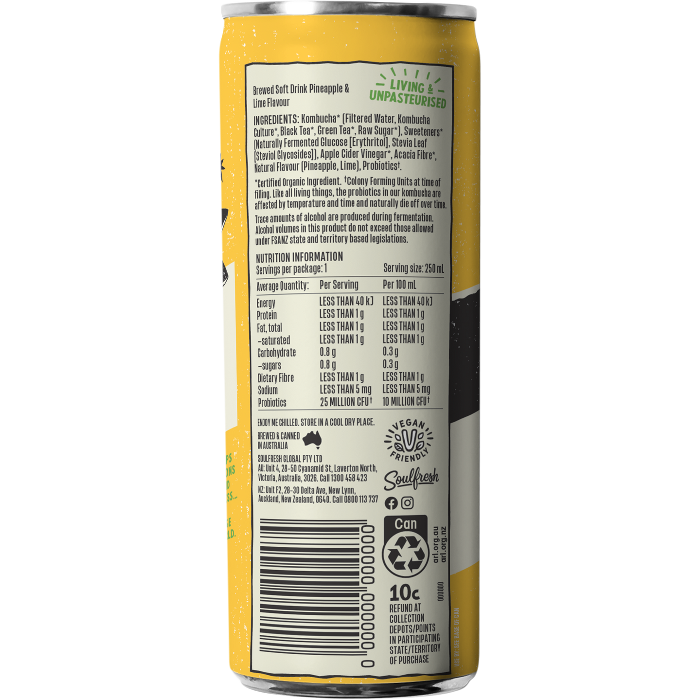 Kombucha* (Filtered Water, Kombucha Culture*, Black Tea*, Green Tea*, Raw Sugar*), Sweeteners* (Naturally Fermented Glucose [Erythritol], Stevia Leaf [Steviol Glycosides]), Apple Cider Vinegar*, Acacia Fibre*, Natural Flavour (Pineapple, Lime), Black Carrot Concentrate, Probiotics†.