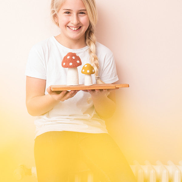 The felt Mushroom is the star of the collection, a must-have in the home! Whimsical and fun, a decorative touch the whole family will enjoy. The mushrooms are cute in children's bedrooms, in the library, or on top of a dresser or occasional table.