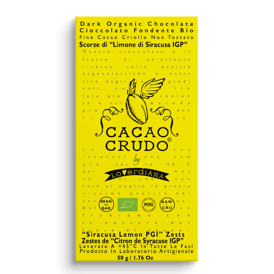 Not roasted cacao Criollo beans paste*, concentrated coconut flower sap*, dried “Siracusa Lemon PGI” zests* (3%) (cocoa solids: 77% minimum).