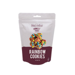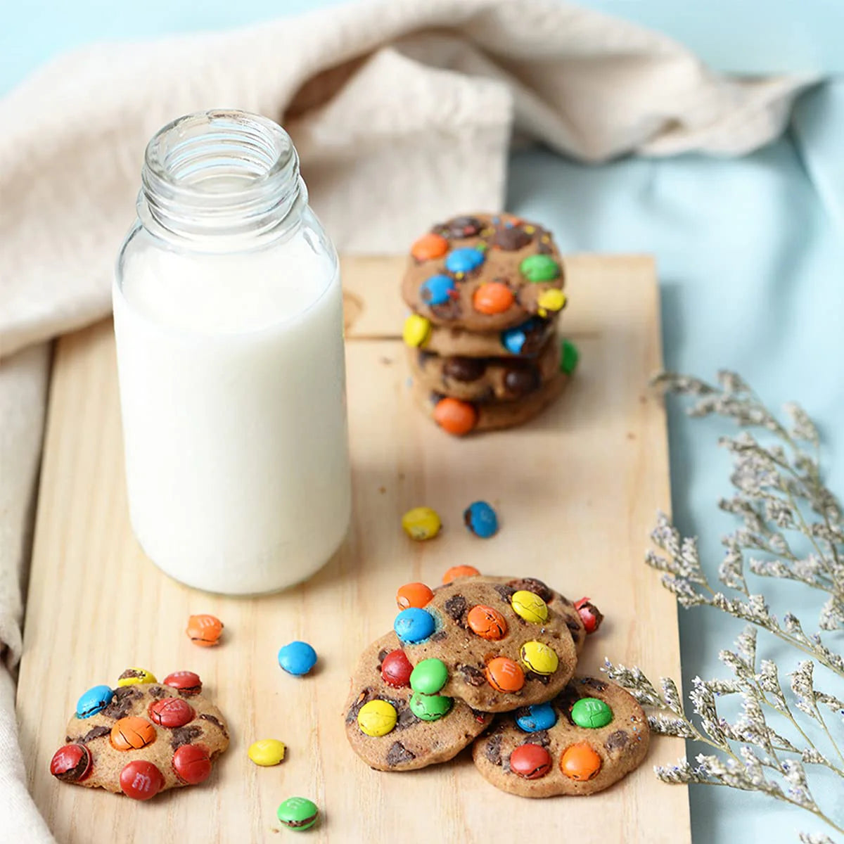 Fun-sized colourful chocolate chip cookies topped with M&M cookies, suitable to be eaten on the go and for sharing.