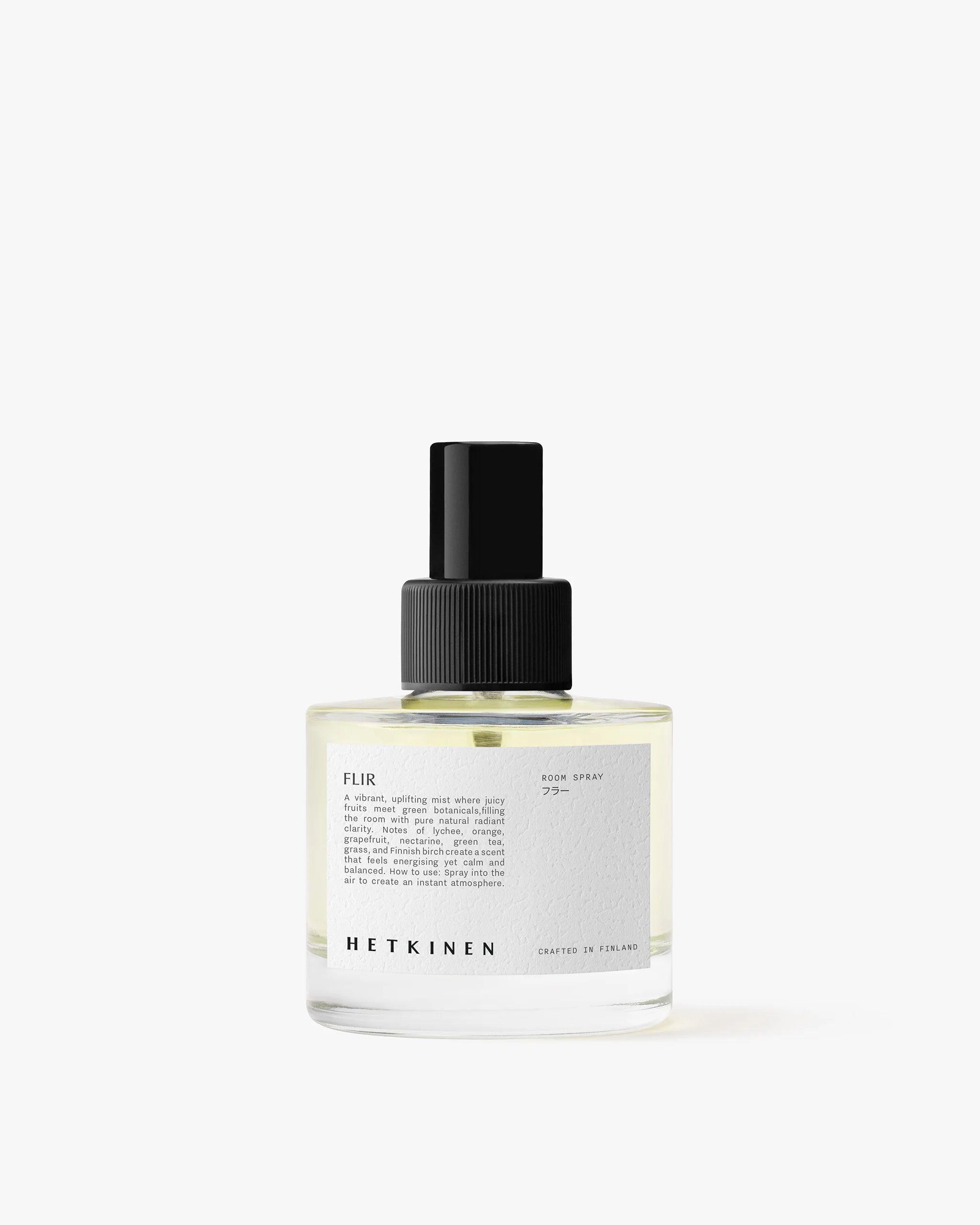 The Flir room spray captures the sparkling lightness of nature — a moment where freshness and joy meet. The scent opens with grapefruit, radiant and bright, while lychee adds a juicy, luminous sweetness. Green tea flows through the heart, smooth and calming, bringing soft balance to the blend. At the base, grass and Finnish birch ground the scent in crisp, natural clarity. With just one mist, the room feels renewed — filled with brightness, movement, and positivity. Designed to refresh both air and mood, Flir is a scent that transforms any moment into lighthearted calm.