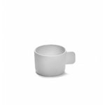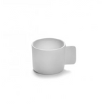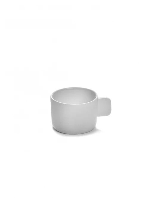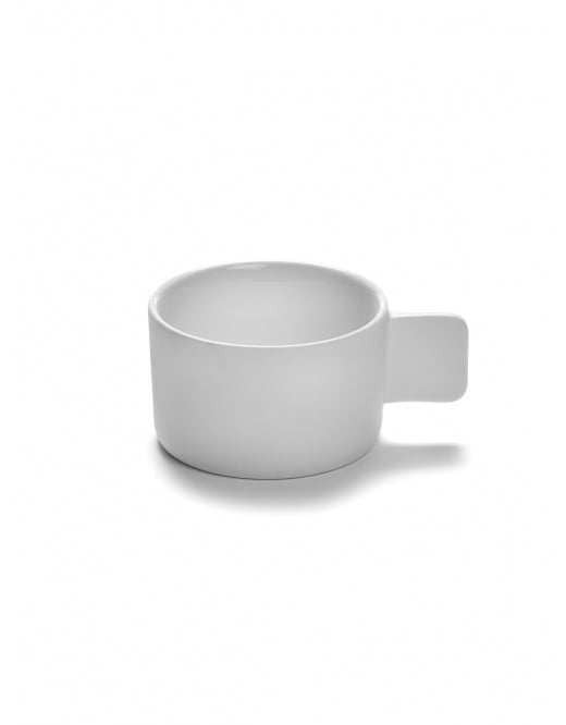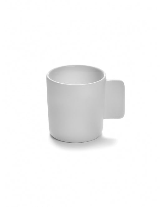 The Heii cups are available in four sizes to suit an espresso, cappuccino, lungo, and latte or tea. Distinctive of the Heii collection are the two versions in white porcelain and grey smoked glass. The eye-catching handles follow the shape of the porcelain underplate.
