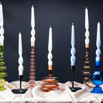 Make a statement with these decorative coloured-glass taper holders from MÆGEN (May-en), they are the perfect pair to our glossy twisted and spiral taper candles.