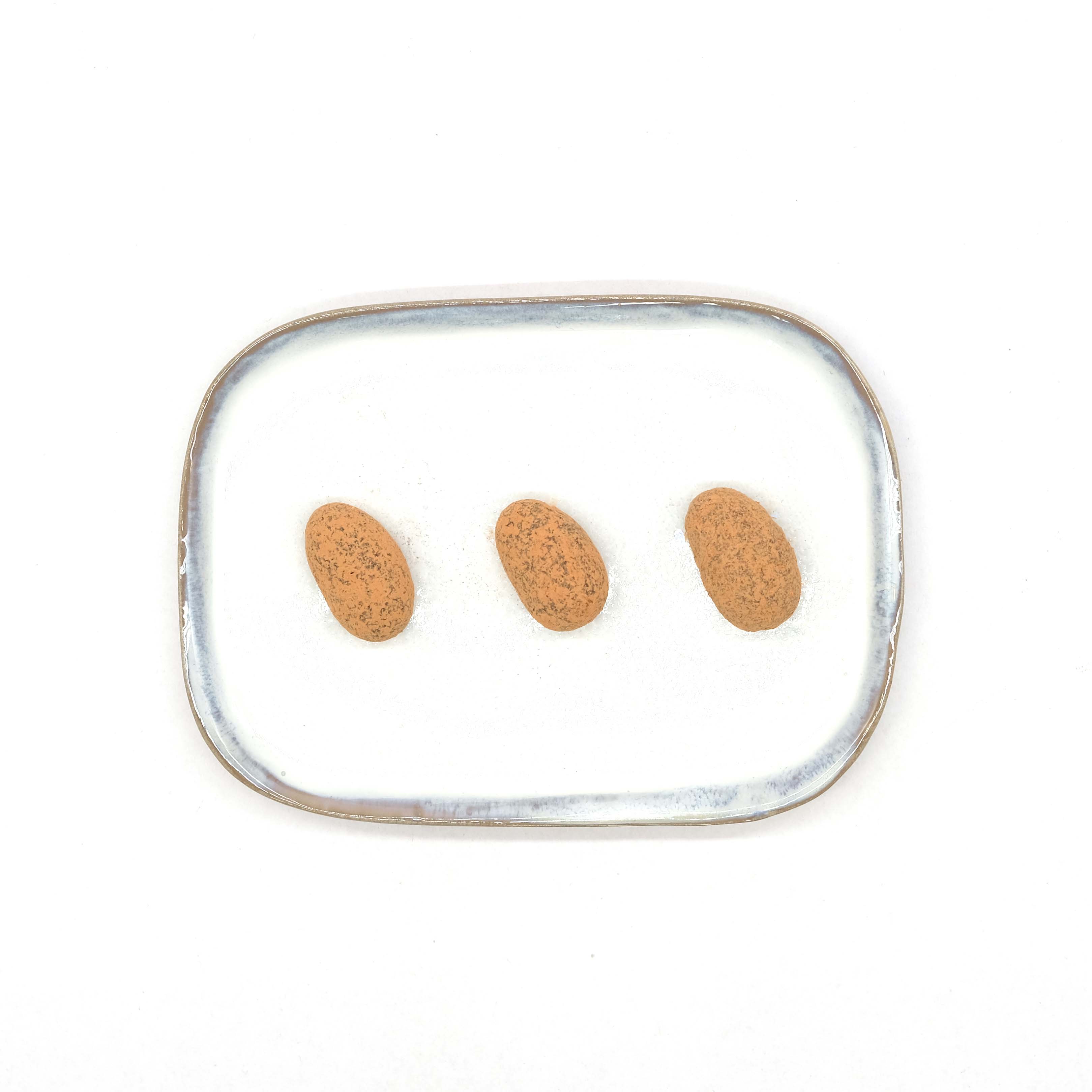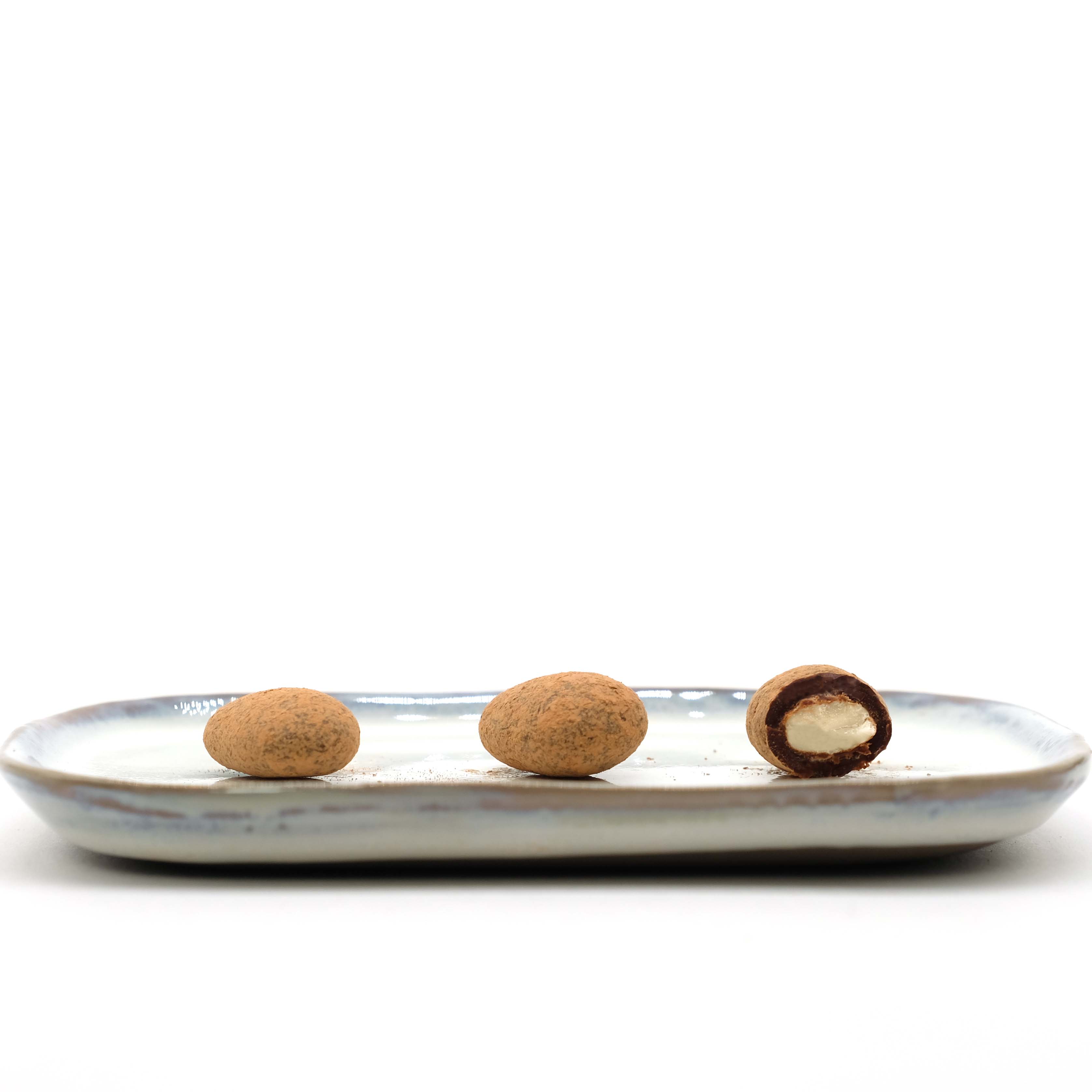 有機生巧克力塗層杏仁。可可固體:最低 66%。焦糖巧克力杏仁,帶有腐朽的可可粉。