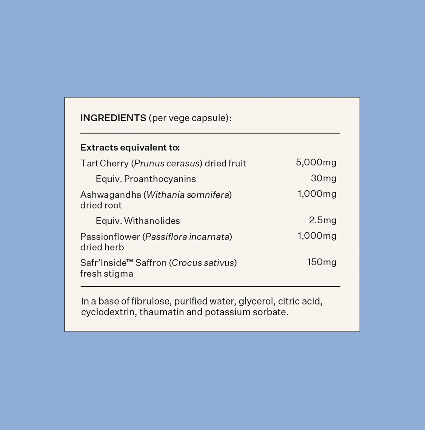 南非醉茄和西番蓮的協同作用有助於平靜心靈,並與促進睡眠的酸櫻桃和藏紅花一起幫助身體進入完全放鬆的狀態,輕鬆進入深度睡眠。