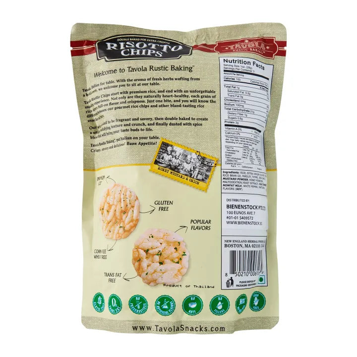 Tavola香脆米餅是正在醞釀中的現代義大利經典,優質美味香脆米餅能完美取代味道平淡的健康米餅,天然有益心臟健康。經過烘焙後每一粒米都充滿風味和鬆脆感。將米飯煮至香噴噴,然後雙重烘烤以獲得完美的鬆脆口感,完美配上蜜糖芥末和洋蔥的濃鬱味道。