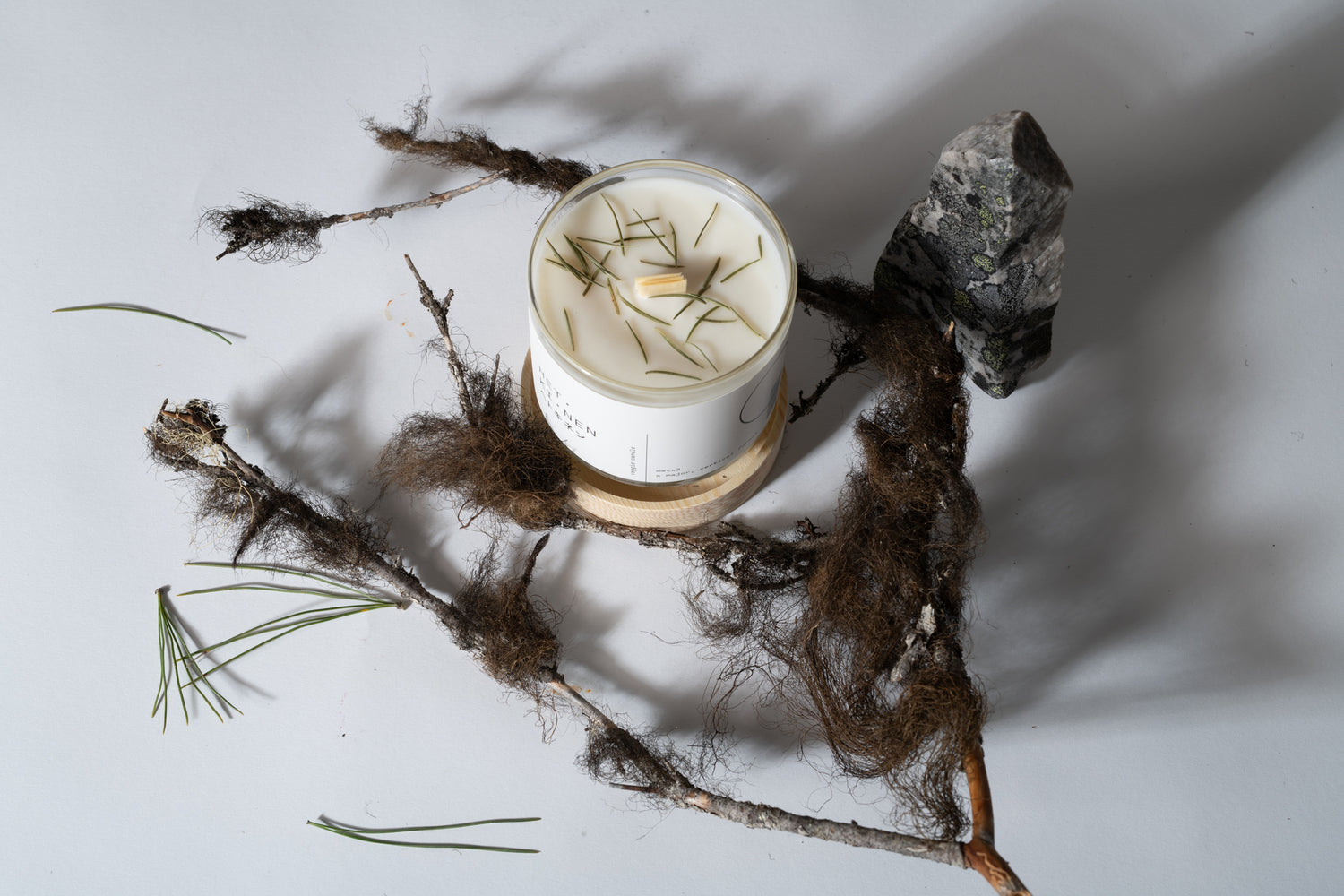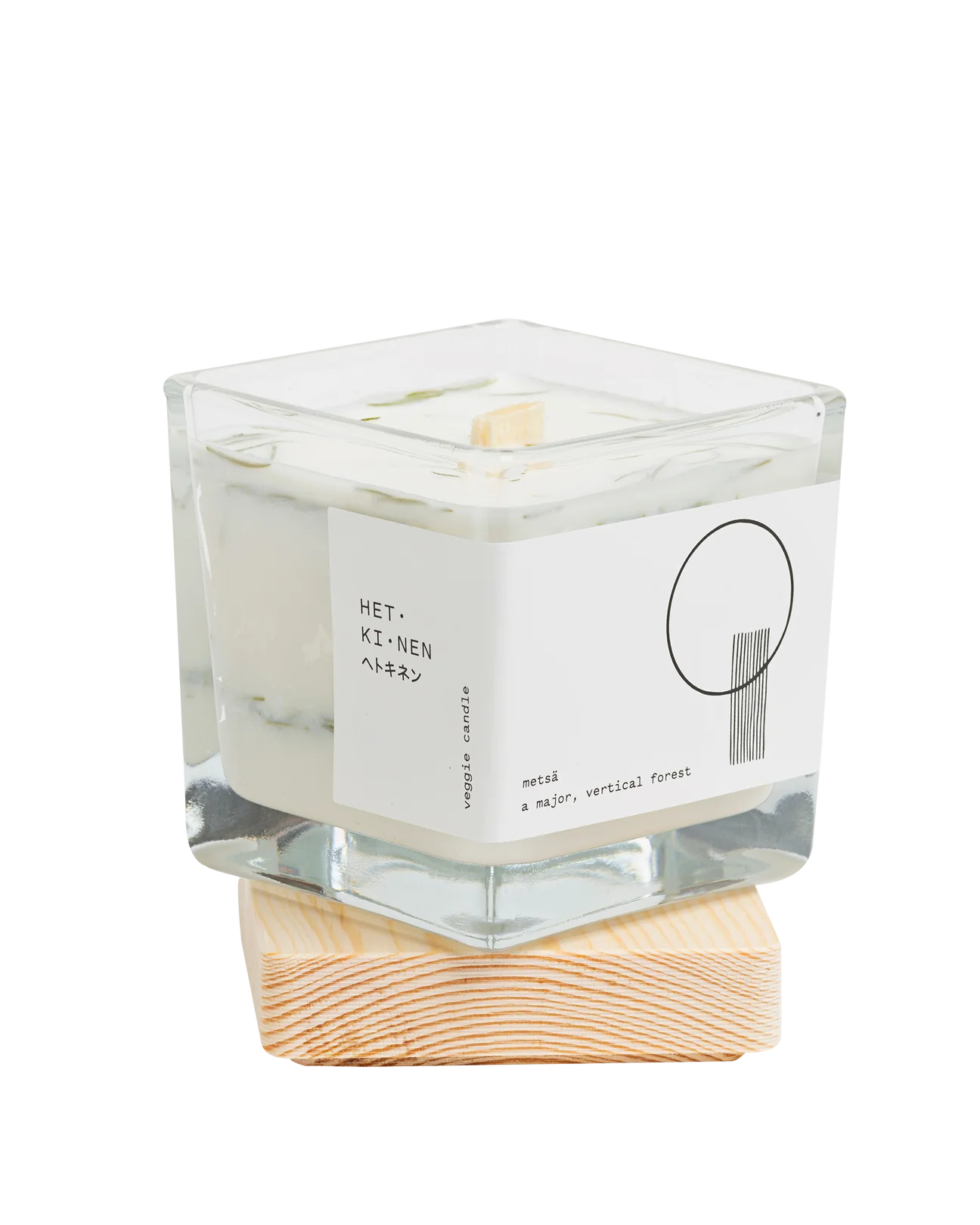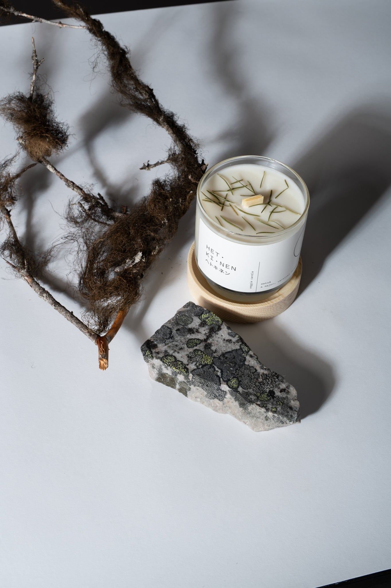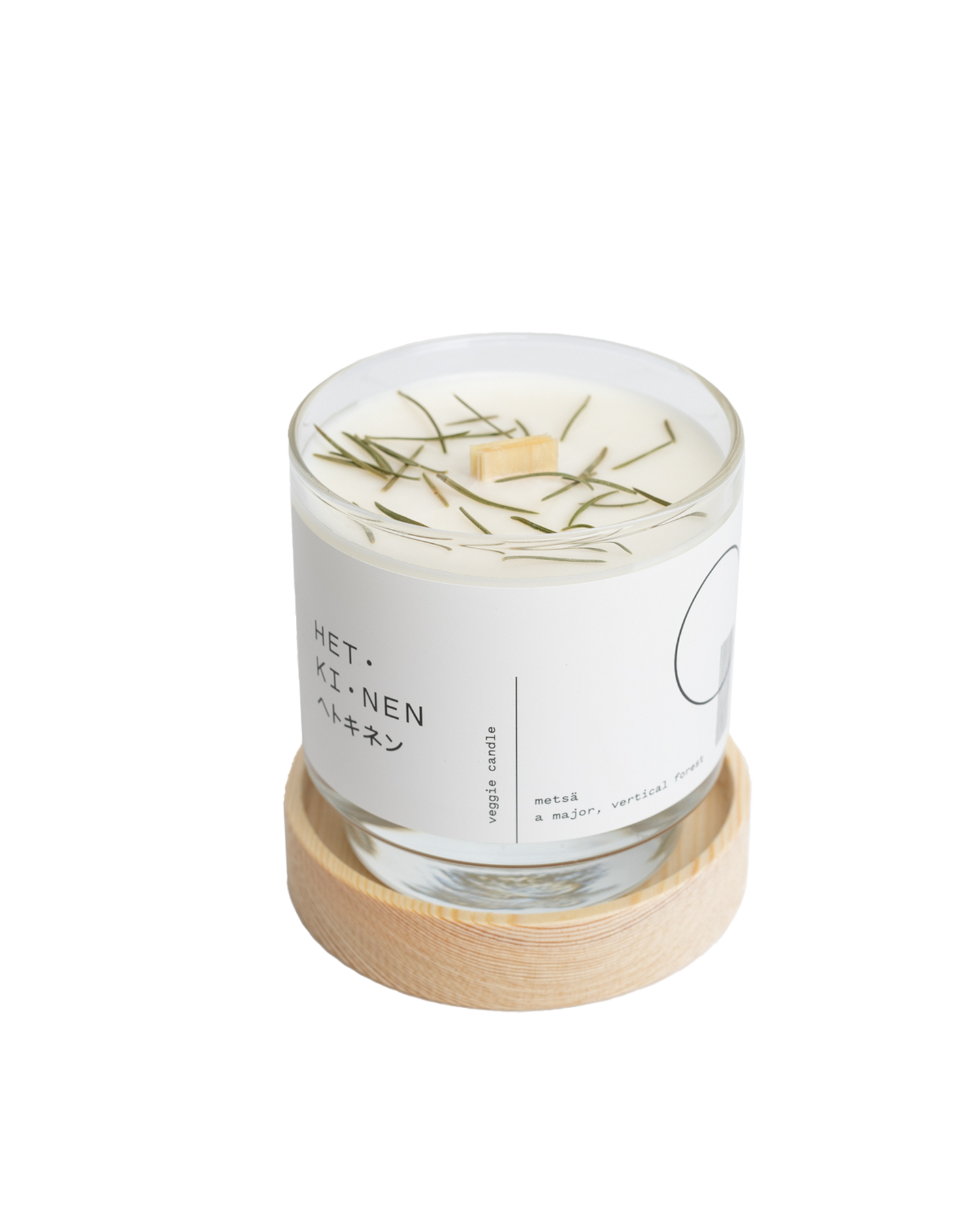 由天然油菜籽和大豆蠟製成的純素蠟燭,配有芬蘭白楊木燭芯,及含有芬蘭冷杉樹脂。