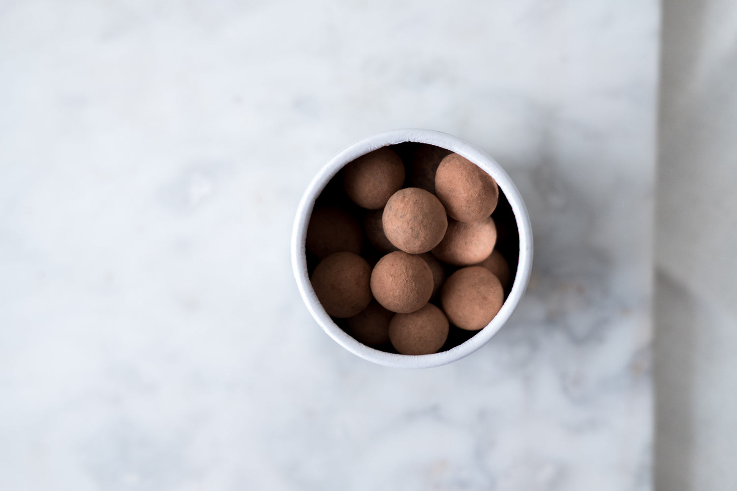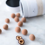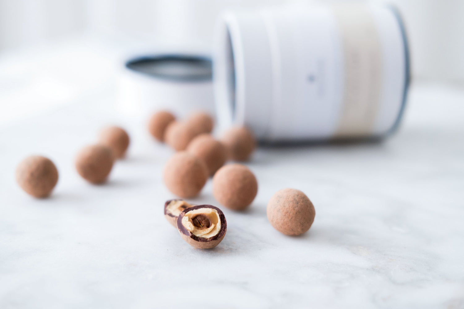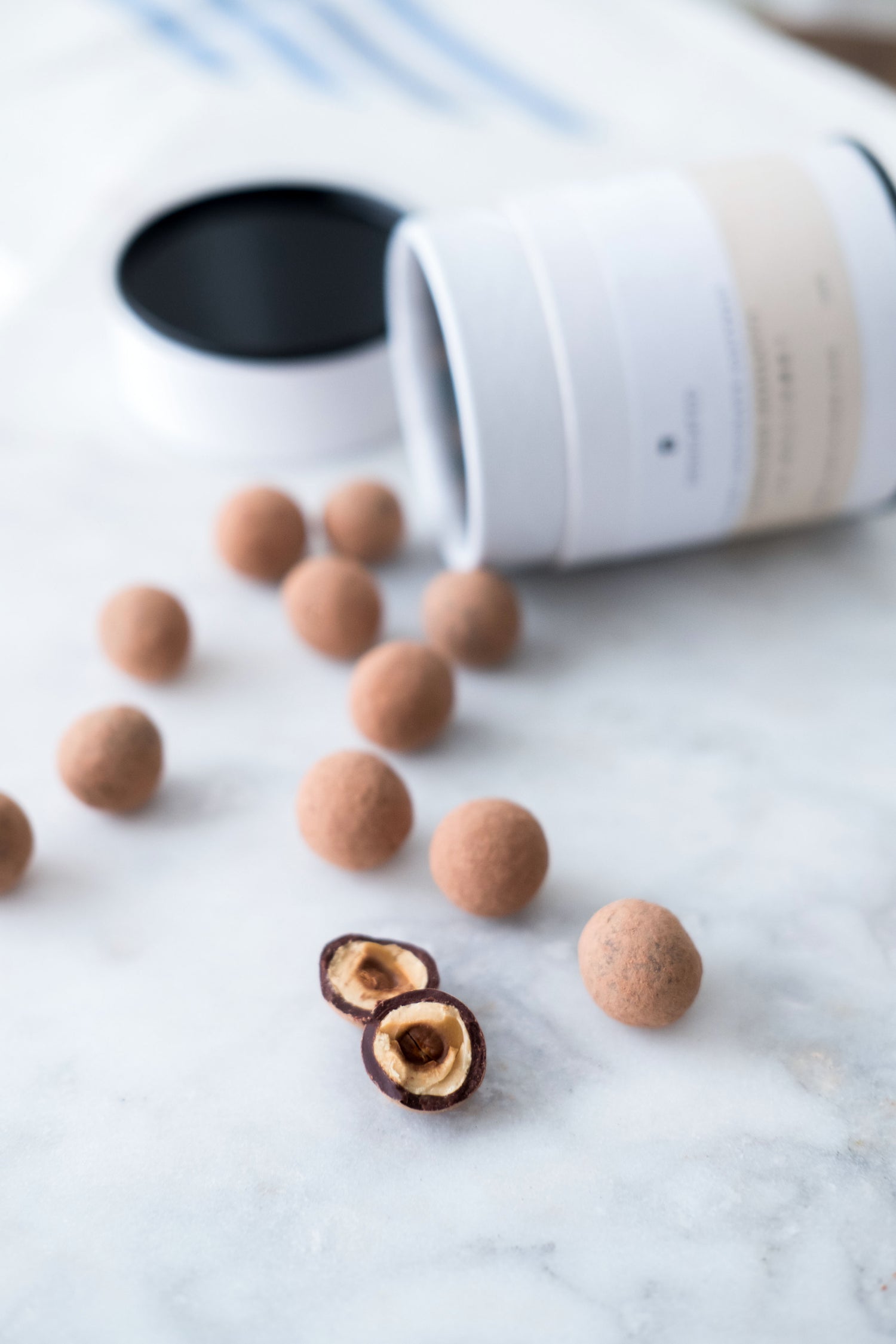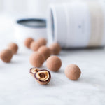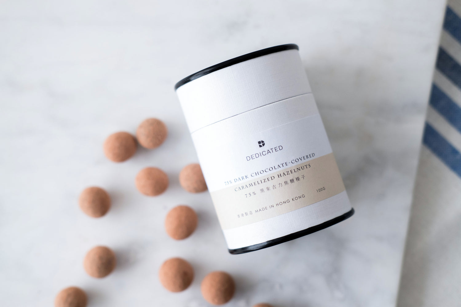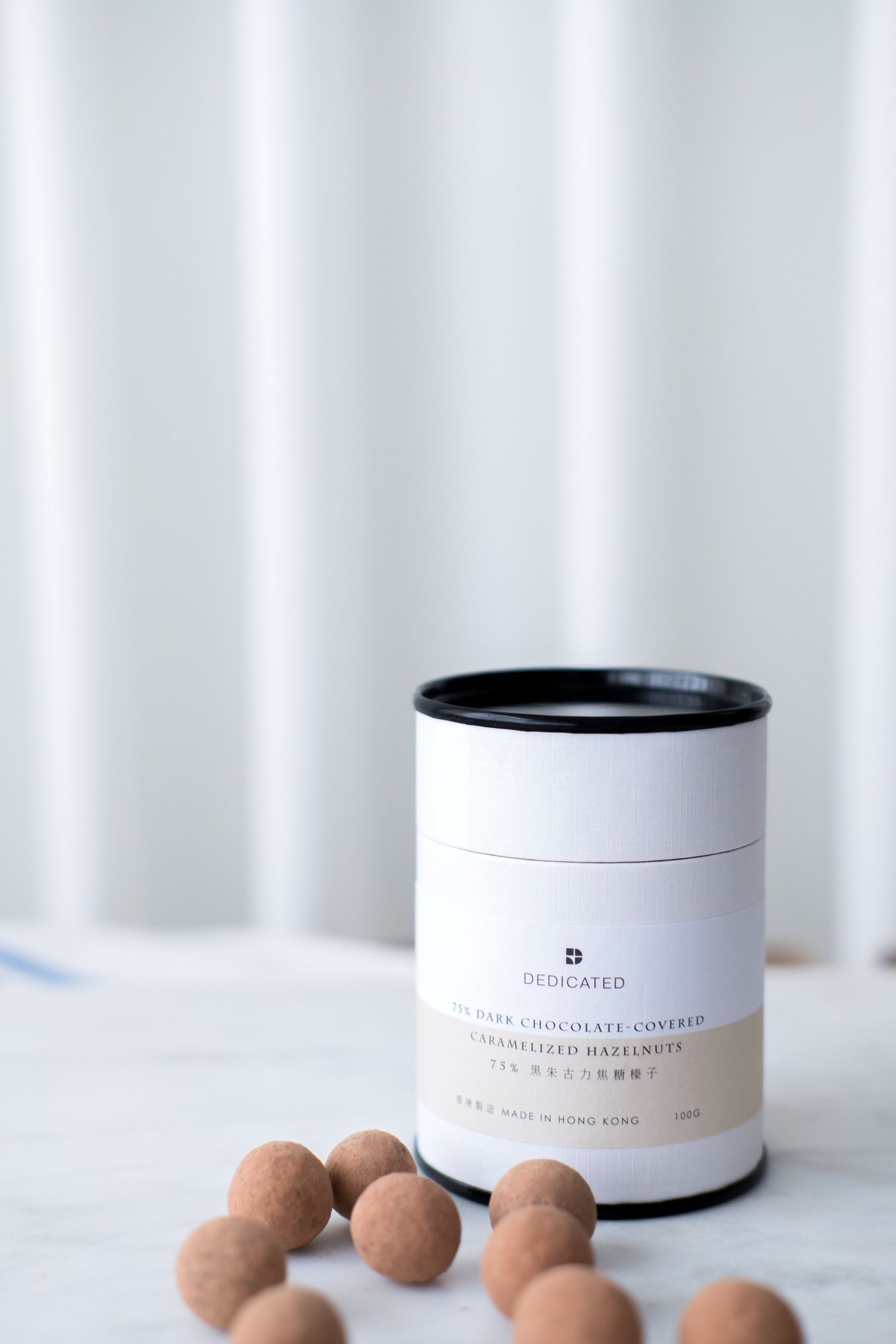 選用高品質的榛子,用焦糖包裹外層使其香甜鬆脆。 然後在焦糖榛子上,反覆地上塗上75% 黑朱古力,形成厚厚的朱古力層。 最後在黑朱古力焦糖榛子外層,撒上秘魯單一產地天然可可粉。