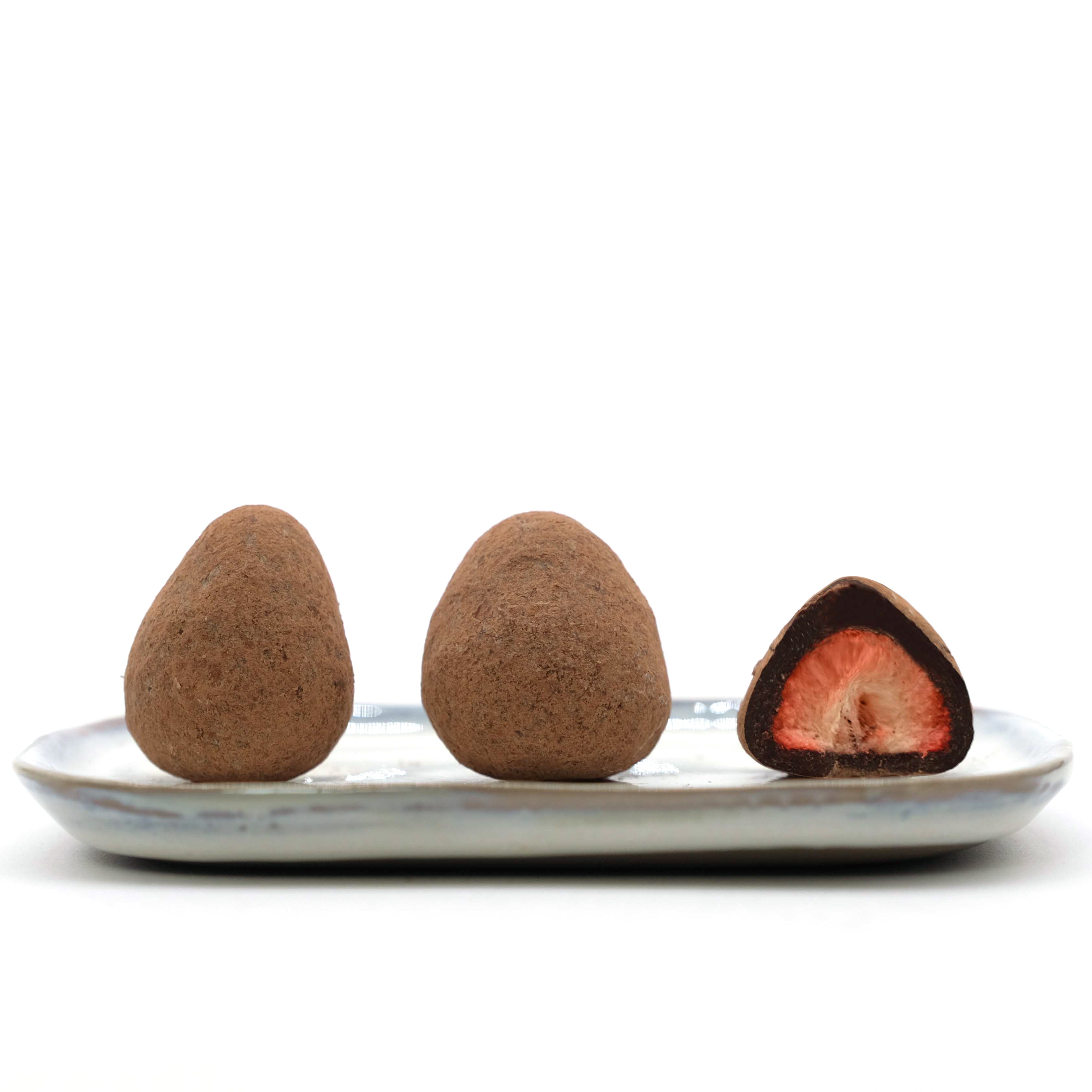 醇滑濃厚的黑朱古力厚厚的包住冷凍乾燥而成的草莓,面層再裹上香濃可可粉。草莓味道酸甜度平衡,口感極脆。入口即溶的黑朱古力同時配上脆脆的草莓,每一口都有雙重享受!