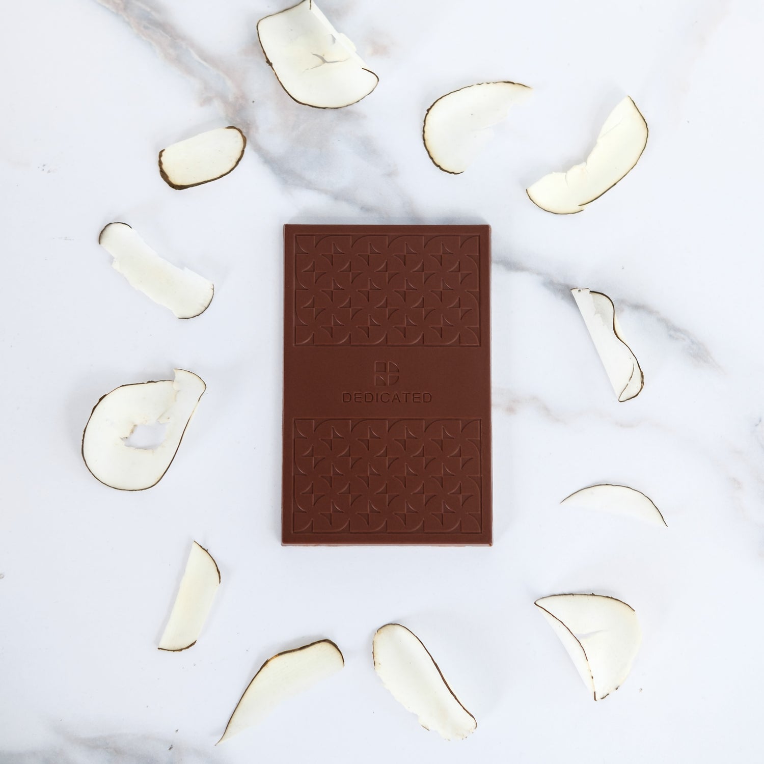 黑朱古力中添加椰子奶粉,椰子味道豐富凸出,帶有像牛奶朱古力感覺的純素黑朱古力,口感順口軟滑。