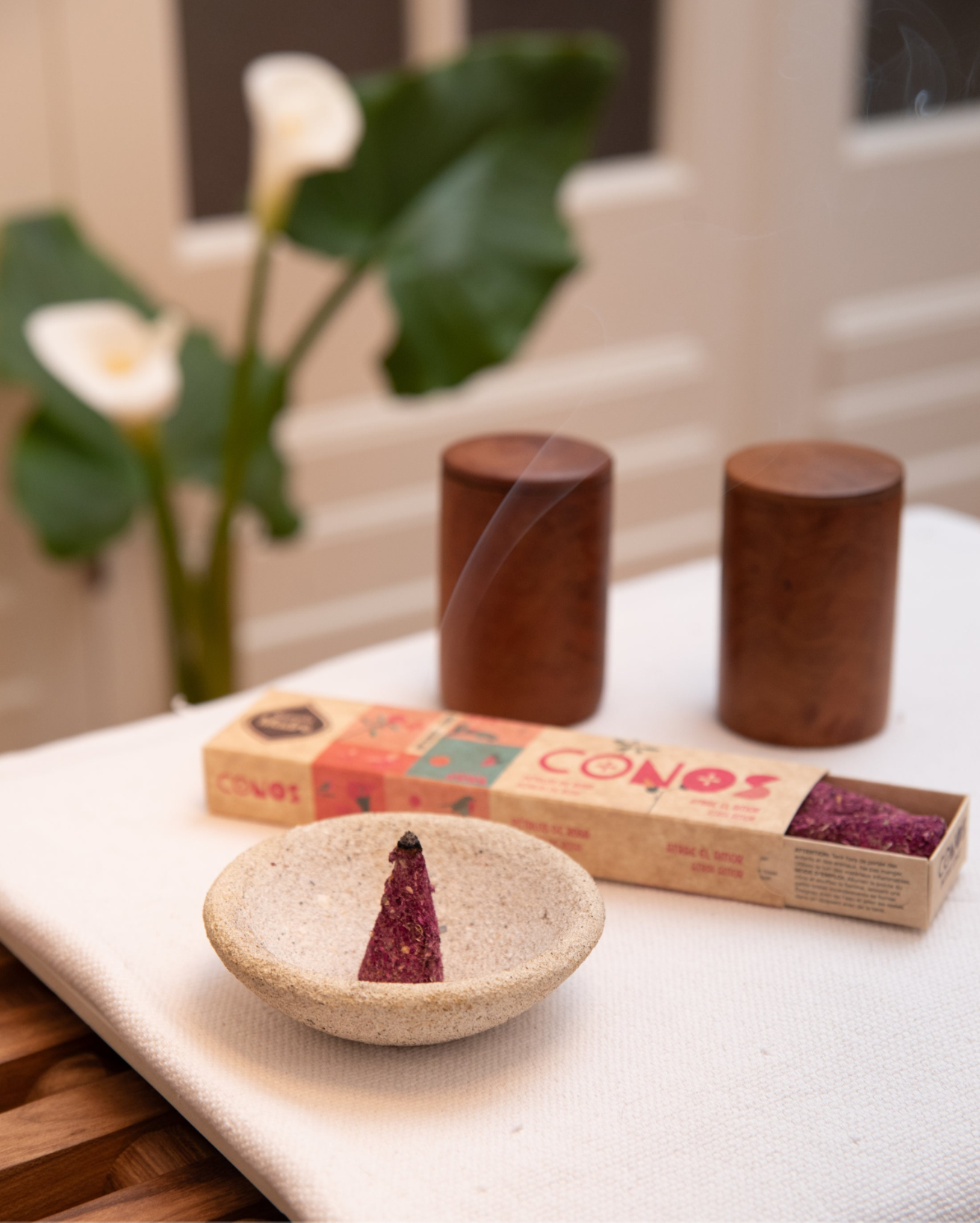 將塔香放在耐熱薰香座上,在通風環境下,用火柴或打火機點燃塔香頂部。燃點後輕輕吹熄火焰。