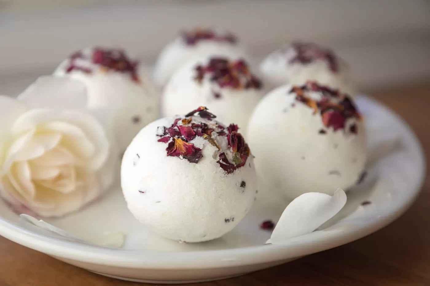 檸檬酸、瀉鹽、小蘇打、橄欖油、玉米粉、金縷梅、玫瑰天竺葵精油和玫瑰精油、鼠尾草和乾燥玫瑰花瓣