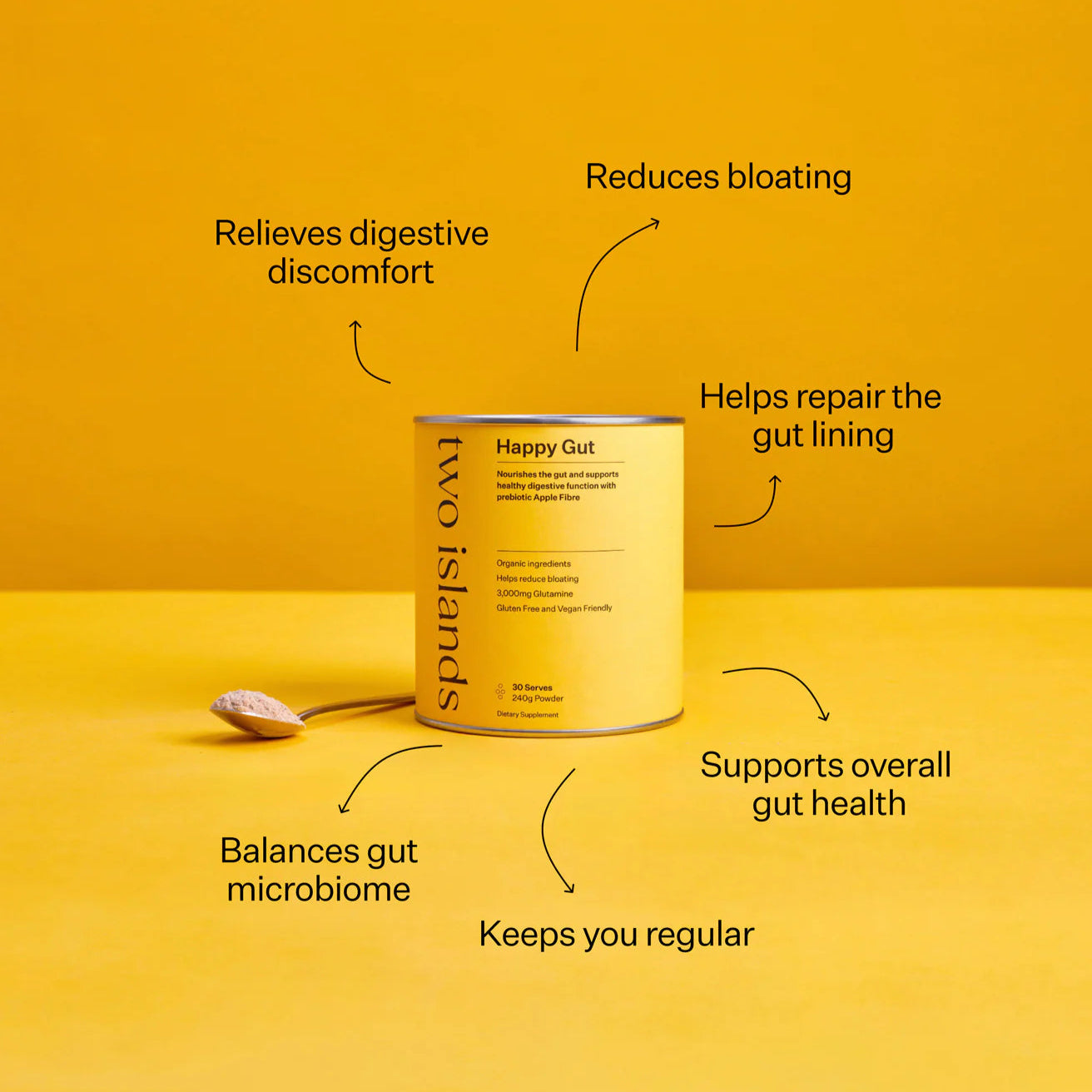 Happy Gut有助減少腹脹,促進腸道益生菌的生長,從而對一系列健康問題產生積極影響,包括腸道健康、皮膚健康、情緒平衡、能量水平、睡眠質素、排便規律、健康免疫力、減少對糖的渴望、消化不良和食物敏感。