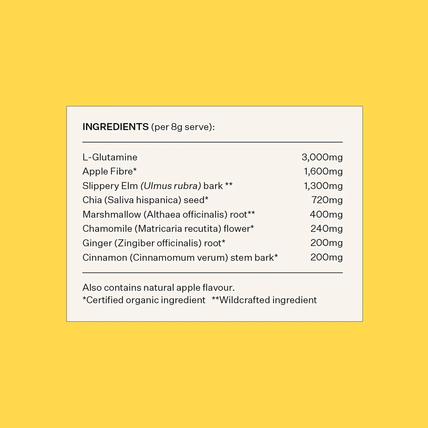 由高強度谷氨酰胺、具舒緩功效的草本和膳食纖維混合而成的特殊配方,旨在促進腸道健康和消化功能。