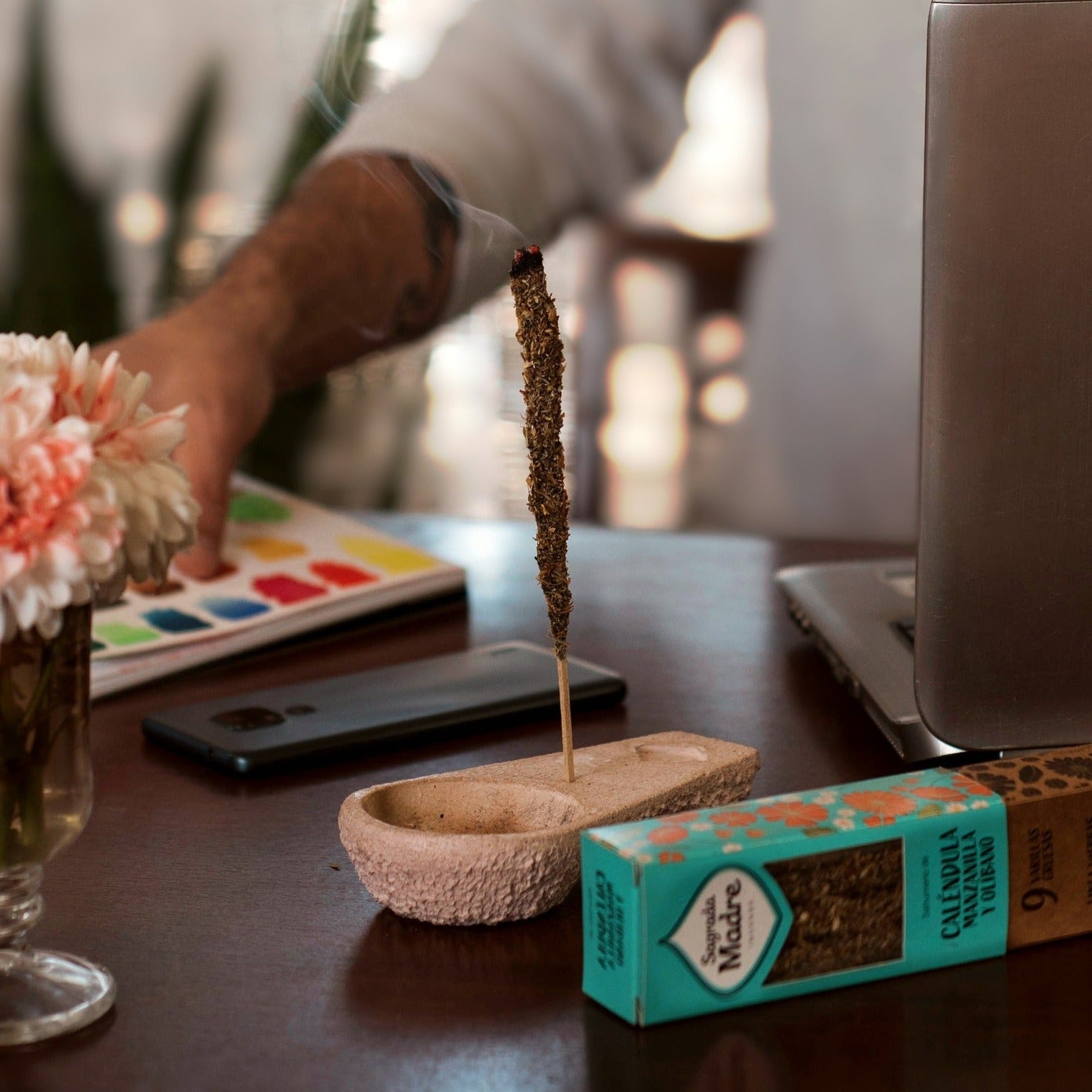 在通風環境下,用火柴或打火機點燃線香。燃點後輕輕吹熄火焰,然後放在耐熱薰香座上。