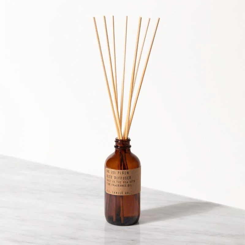 P.F. Candle的擴香瓶採用藥劑師風格的琥珀色玻璃瓶,並配上標誌性的牛皮紙標籤和蘆葦擴香棒。為空間帶來全天候的淡淡香氣,而無需使用明火。