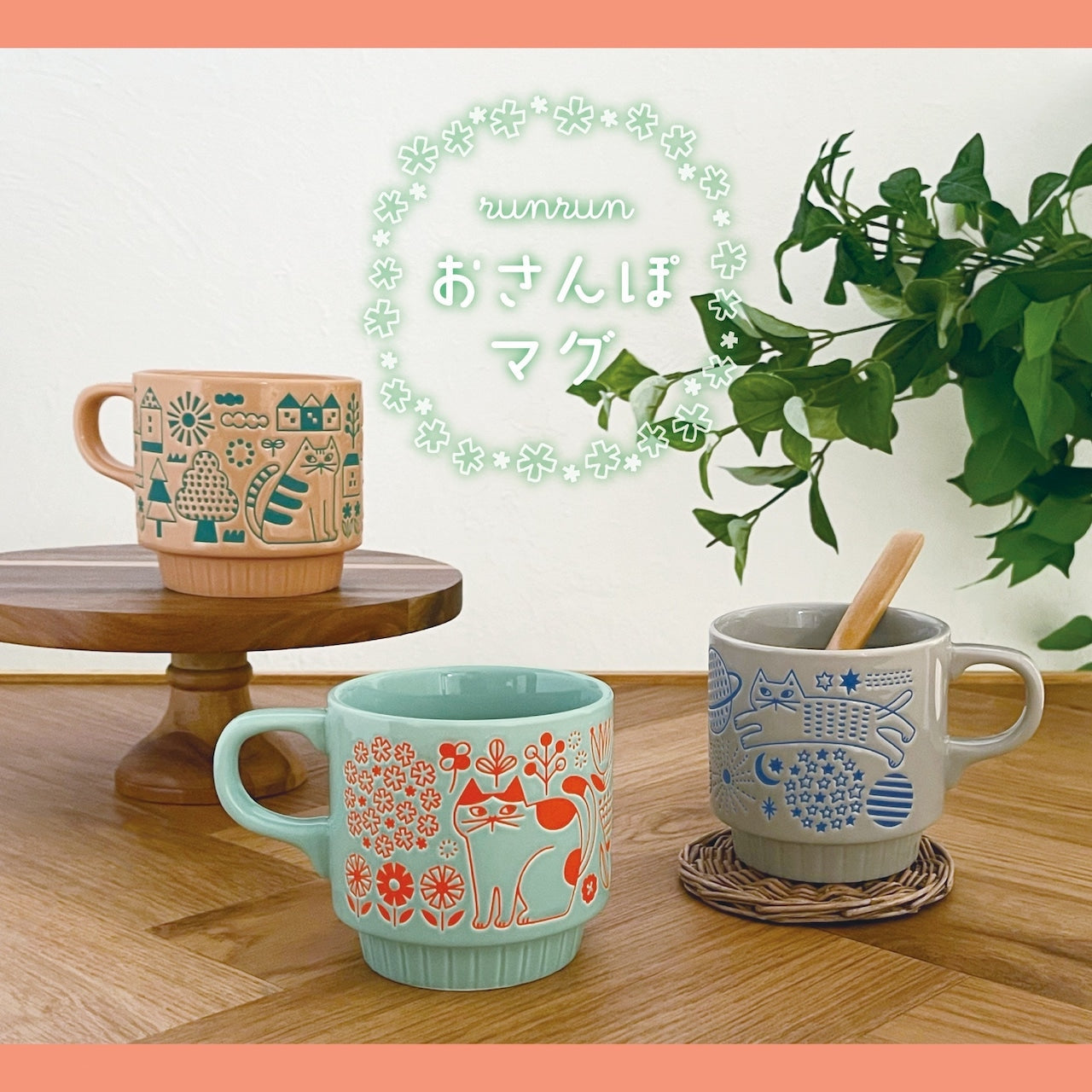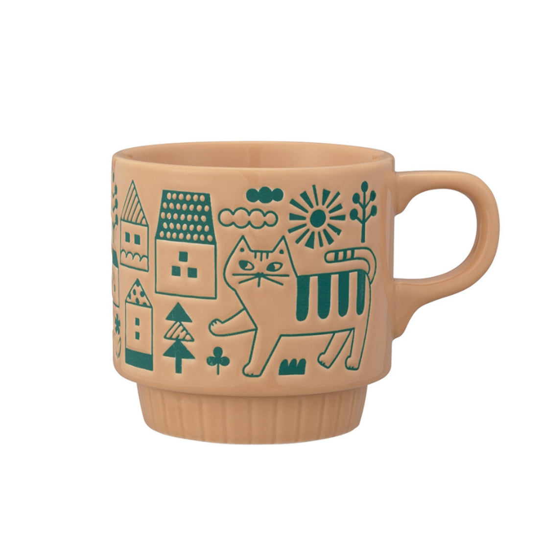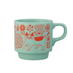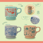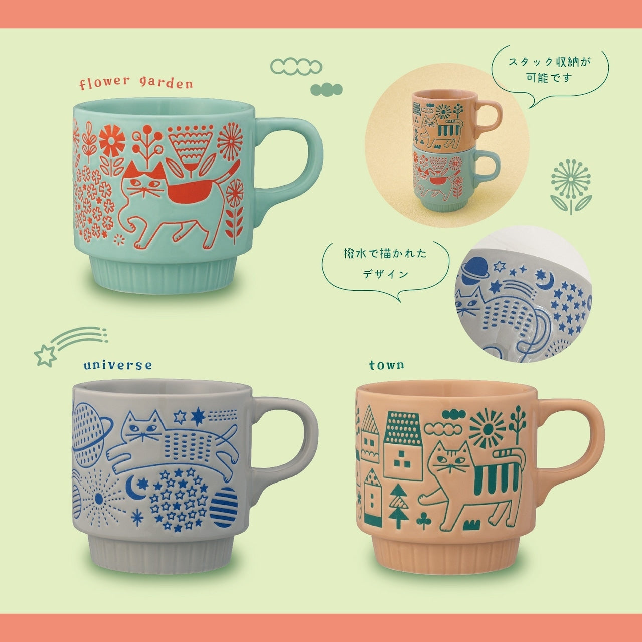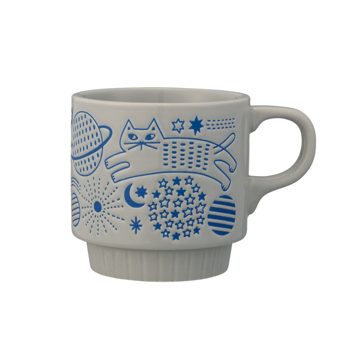 馬克杯飾有精緻的壓紋圖案。一邊品茶,一邊欣賞貓咪漫步花田、太空或城市的圖案。馬克杯可以疊放,不佔空間方便收納。
