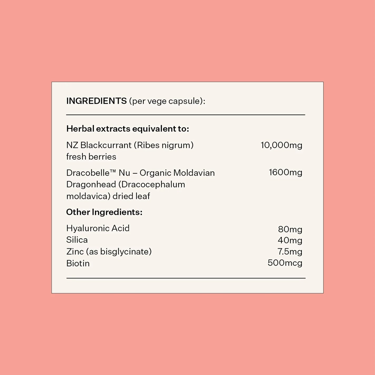 DracoBelle™ Nu 加上富含維生素 C 的新西蘭黑加侖和鋅,為皮膚提供天然膠原蛋白生成所需的基本組成部分。100%植物成分的獨特配方,是十分適用素食者的膠原蛋白生成劑。